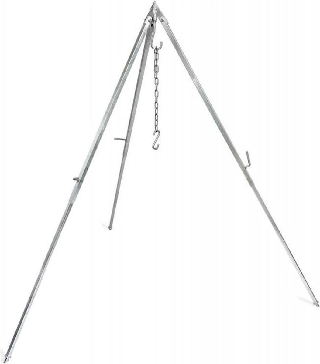 Een zeer stabiele 3-poot. Deze 3-poot is ideaal om de Dutch Oven aan te bevestigen en de pan vervolgens boven het vuur op te hangen. Beschikt over verstelbare poten, zodat deze ook op een ongelijke ondergrond stabiel kan worden afgesteld. De driepoot kan op verschillende hoogtes worden afgesteld. Ook geschikt om met andere pannen te koken boven een kampvuur.